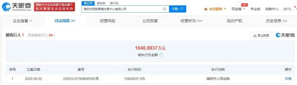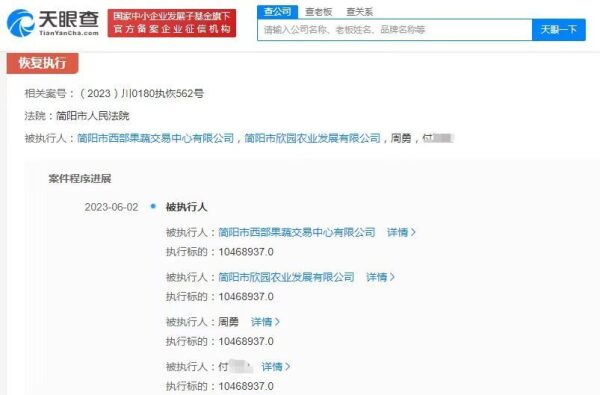 天眼查App显示,近日,周勇、简阳市西部果蔬交易中心有限公司、简阳市欣园农业发展有限公司、付某某新增一则恢复执行信息,执行标的1046万余元,执行法院为简阳市人民法院。