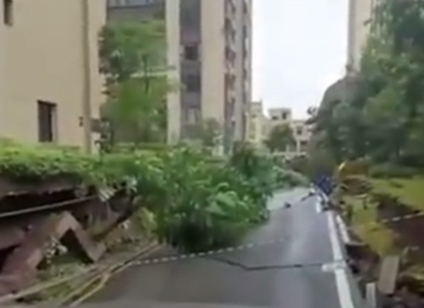 视频显示一大段道路塌陷,旁边的楼房地基裸露。6月5日中午,锦绣江南小区一名业主表示,事发在上午10时左右,目前塌陷道路已经被封。