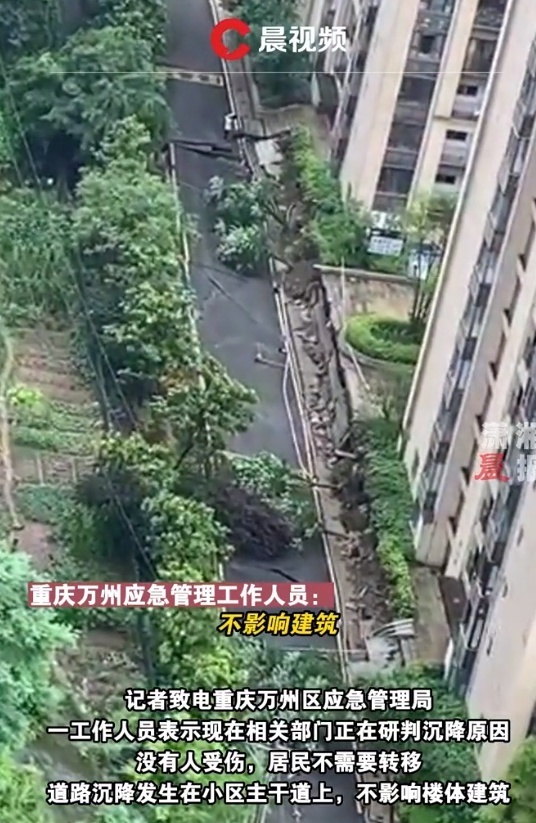重庆万州区应急管理局一工作人员表示,现在相关部门正在研判沉降原因,没有人受伤,居民不需要转移,道路沉降发生在小区主干道上,不影响楼体建筑。