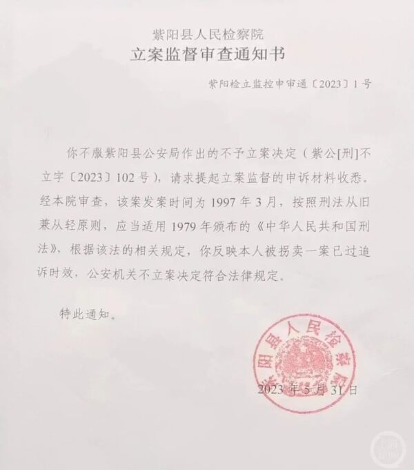 今年3月24日,这场听证会在陕西紫阳县人民检察院召开。5月31日,紫阳县人民检察院向牛雨航签发的《立案监督审查通知书》显示,“你不服紫阳县公安局作出的不予立案决定(紫公[刑]不立字[2023] 102号),请求提起立案监督的申诉材料收悉。经本院审查,该案发案时间为1997年3月,按照刑法从旧兼从轻原则,应当适用1979年颁布的《刑法》。根据该法的相关规定,你反映本人被拐卖一案已过追诉时效,公安机关不立案决定符合法律规定。”