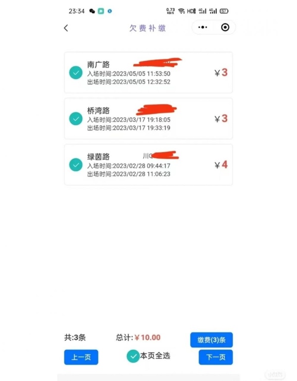 从杨女士发布的图片来看,一张是“宜宾智慧停车”发出的停车欠费追缴通知,内容是该停车服务公司向叙州区人民法院提起了批量诉讼,如果车主在法院正式受理前未缴清停车费,将承担诉讼费、律师费、执行费、利息等费用;另一张图则是车主所欠停车费用——南广路(停车时间5月5日,欠费3元)、桥湾路(停车时间3月17日,欠费3元)、绿茵路(停车时间2月28日,欠费4元),合计欠费10元。