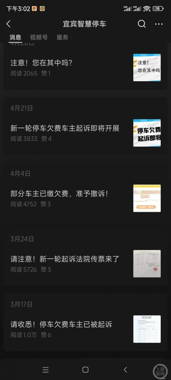记者还查看了“宜宾智慧停车”的微信公众号,该公众号中有多篇文章提到了起诉欠费车主,还公布了部分法院传票以及民事裁定书,以此证明不是光说不做。