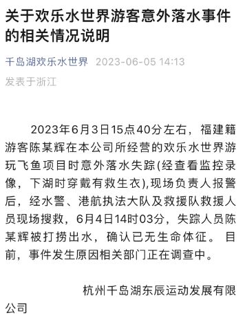 说明称,2023年6月3日15点40分左右,福建籍游客陈某辉在本公司所经营的欢乐水世界游玩飞鱼项目时意外落水失踪(经查看监控录像,下湖时穿戴有救生衣),现场负责人报警后,经水警、港航执法大队及救援队救援人员现场搜救,6月4日14时03分,失踪人员陈某辉被打捞出水,确认已无生命体征。目前,事件发生原因相关部门正在调查中。