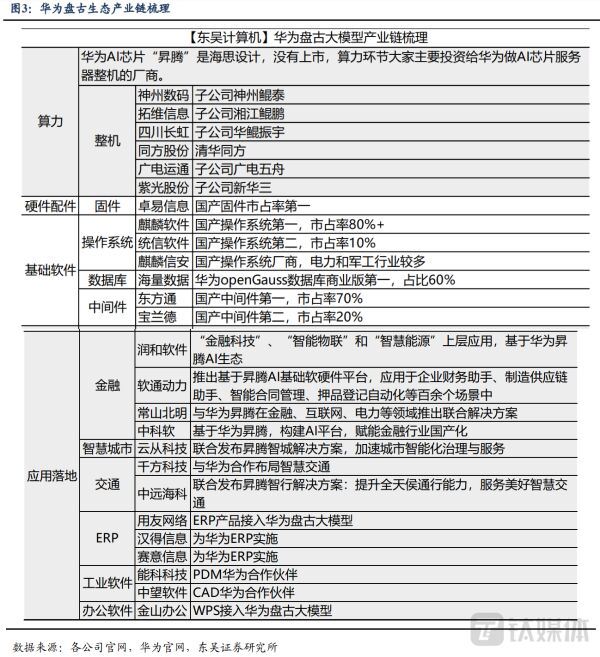 东吴证券3月27日公布的研报中称,华为盘古大模型的优势在于人才储备和算力自主可控,有望成为国内领先的大模型,其生态产业链标的有望迎来加速发展,包括拓维信息、四川长虹、麒麟软件(中国软件)、统信软件(诚迈科技)、麒麟信安等华为生态公司。国盛证券则认为,华为盘古为首个多模态千亿级大模型,有望赋能百业。