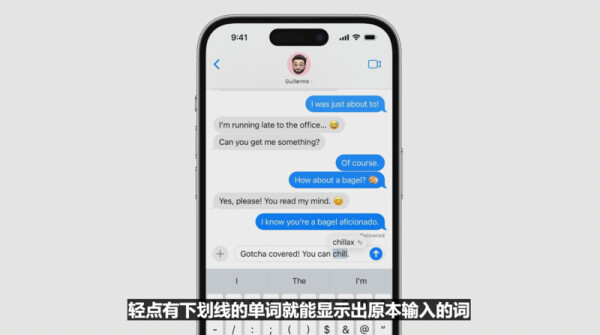 用户在输入的过程中如果输错信息可以轻点有下划线的单词,便可以自动纠正,并且iOS 17还有着预测输入功能,用户轻点有下划线的单词就可以显示出原本想输入的词。此功能可以非常快速地输入下个词甚至直接完成整个句子。因此语音识别也更加的精准。