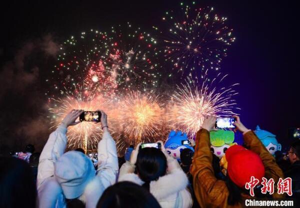 市民游客纷纷拍照记录烟花秀。 黄强 摄