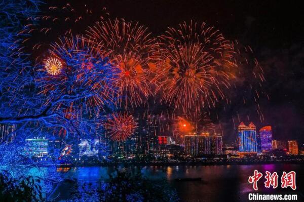 千家春不夜,万里月连宵。2月4日晚,在元宵佳节来临之际,一场大型烟花秀在杭州桐庐富春江畔精彩上演。江面上1万余枚烟花腾空而起,点亮了深邃的夜空,照耀着桐君山和富春两岸。