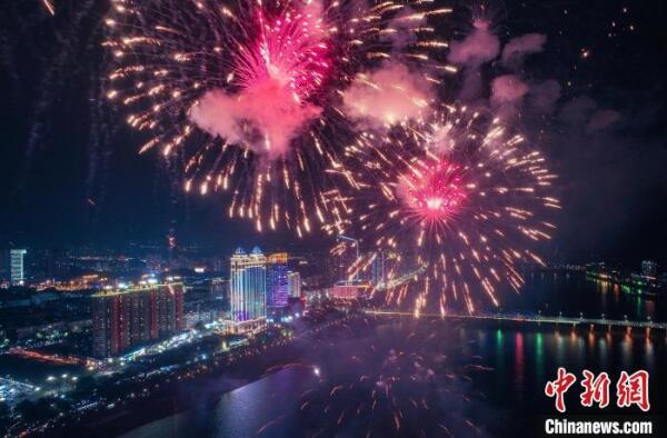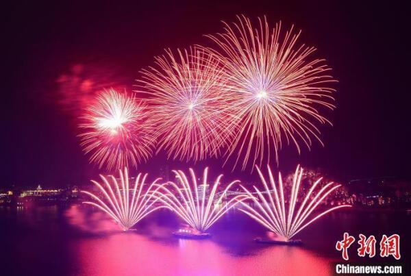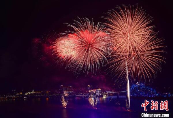 杭州富春江畔上演大型烟花秀。 黄强 摄