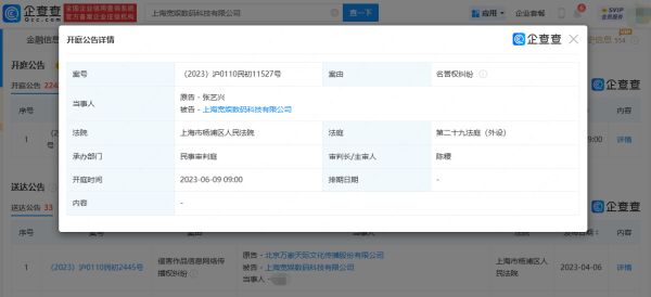 企查查APP显示,近日,B站关联公司上海宽娱数码科技有限公司新增一则开庭公告信息,系张艺兴诉其侵犯名誉权案,计划将于6月9日上午9点开庭审理。