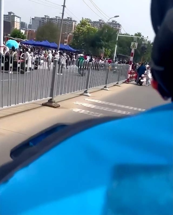 视频中,一身穿蓝色外卖服的小哥骑着摩托车带着考生,飞速在马路上驰骋。
