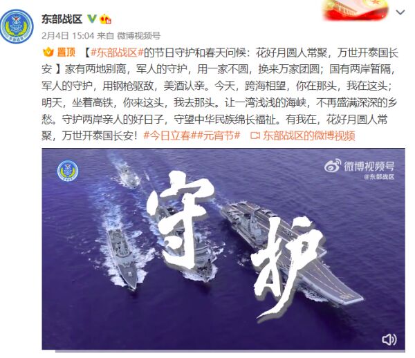 绿媒“三立新闻网”称,解放军东部战区4日在微博发布最新战训MV,主题是《东部战区的节日守护和春天问候》,这支新MV用旁白呈现,刚开始的画面是解放军军人在与孩子视频,告知要出任务。