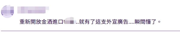 对此,有岛内网友说,大陆重新开放金酒输入,就有了这支外宣广告,瞬间懂了。