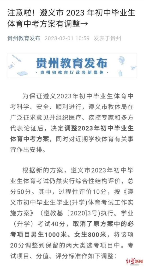 2月1日,贵州省教育厅转发遵义调整体育中考的消息