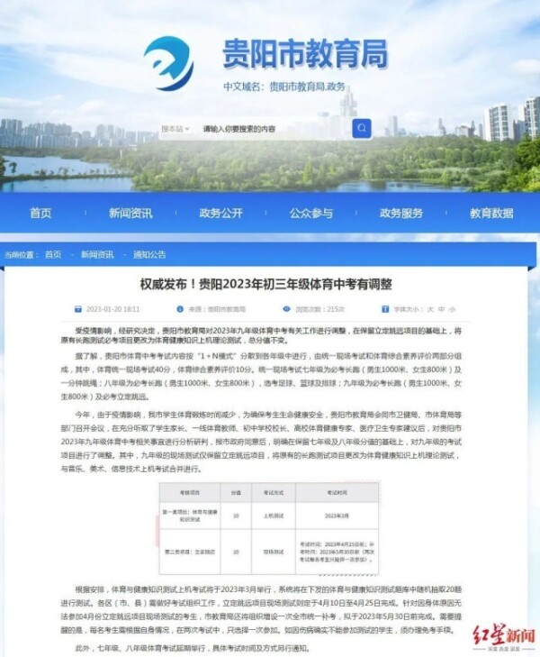 1月20日,贵阳市教育局发布调整体育中考的消息