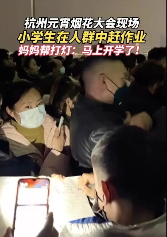 时隔11年,杭州重启烟花秀,3万发烟花点亮夜空,可是在杭州元宵烟花大会现场,有市民拍到小学生正在人群中补作业,妈妈在一旁打灯,这种场景不由得让人们产生共鸣,想起学生时代的自己。