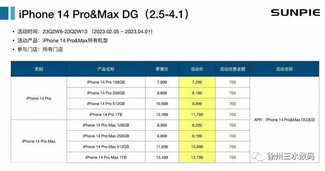 从曝光的图片来看,这是苹果授权经销商 SUNPIE 的内部文件,资料中重点提到了两款机型的降价计划,iPhone 14 Pro 和 iPhone 14 Pro Max 所有版本均下调 700 元,时间从 2 月 5 日持续到 4 月 1 日,覆盖所有门店。