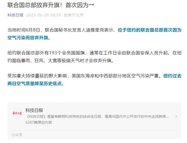 导读:当地时间6月8日,联合国秘书长发言人迪雅里克表示,位于纽约的联合国总部首次因为空气污染而放弃升旗。
