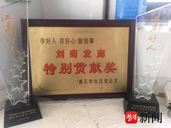 记者在店内看见,小小发廊,获得不少荣誉。有江都区仙女镇禹王宫社区党总支颁发的“学好人、存好心、做好事特别贡献奖”奖牌,有江都区委宣传部、江都区文明办颁发的“江都好人”奖杯,有地方颁发的“诚实守信”大拇指奖杯。这些都是对“刘菊发廊”数十年低价经营、用心服务的最高褒奖。
