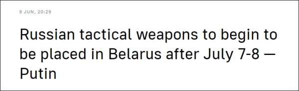 “在我们彼此商定的最敏感问题上,一切都按计划进行。”普京对卢卡申科说,“相关设施的准备工作将于7月7日至8日结束,在那之后我们将立即开始在你们的领土上部署相关武器的行动。因此,一切按计划进行,一切都在稳步推进。”