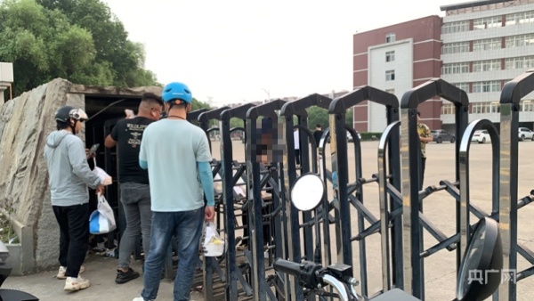 6月8日19时许,不断有派送员前来学校送餐(央广网记者胡斐摄)