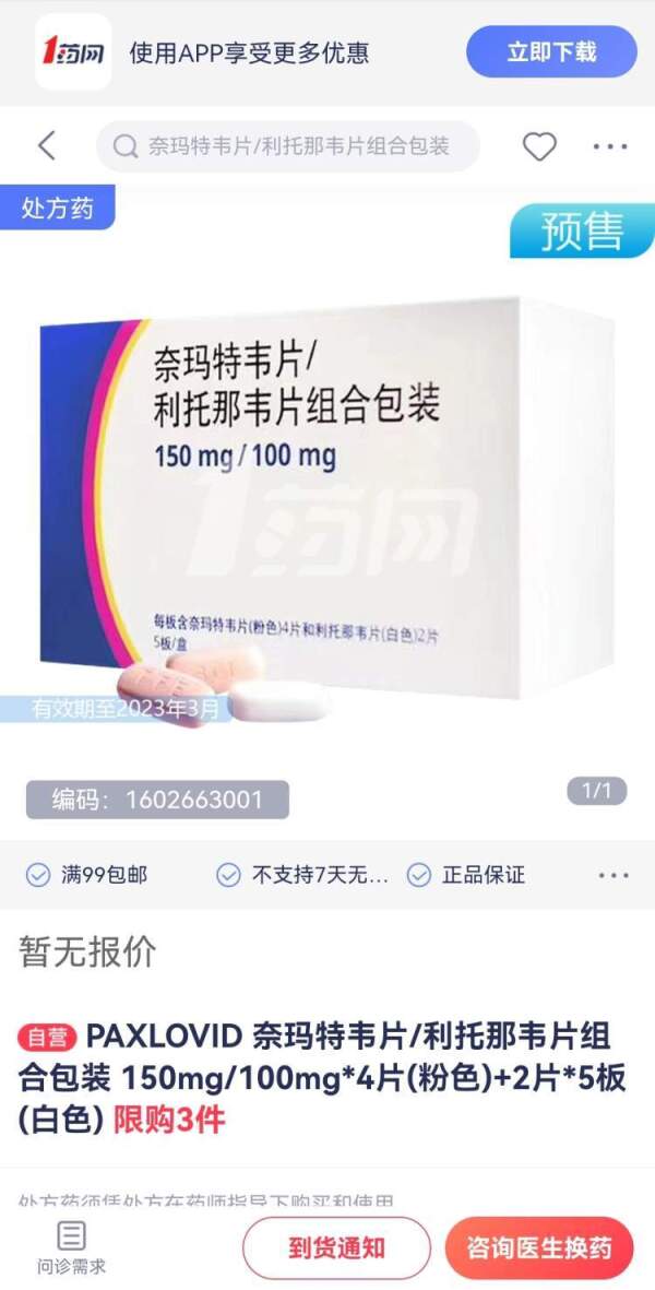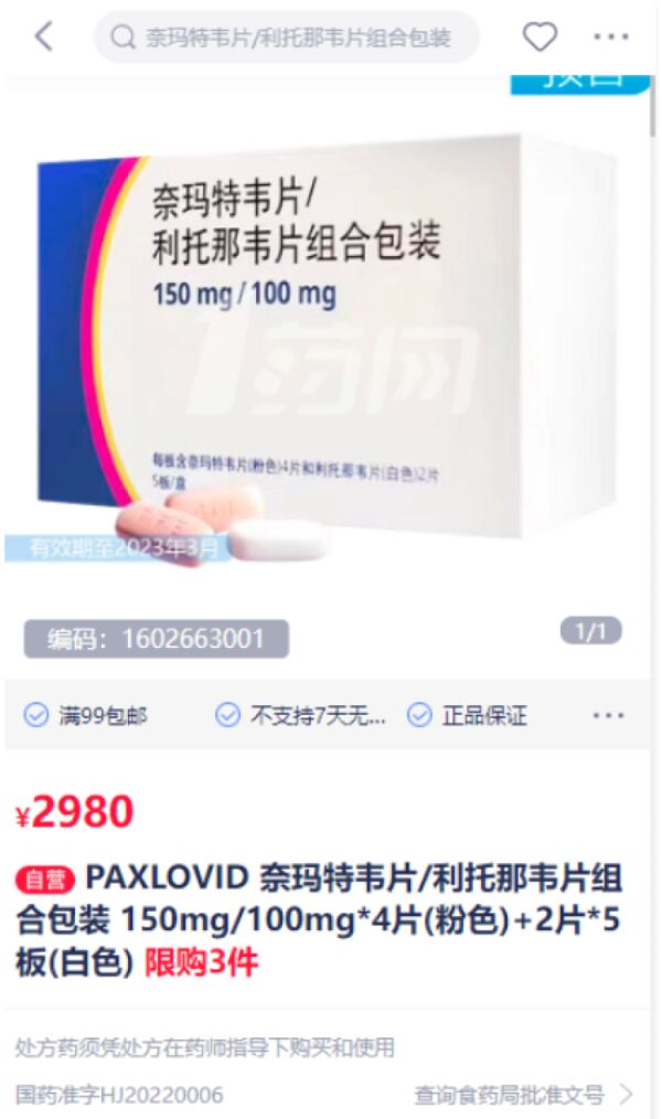 12月13日,1药网旗下互联网医院已开始预售辉瑞口服抗新冠病毒药物Paxlovid(奈玛特韦/利托那韦片),定价为2980元/盒。