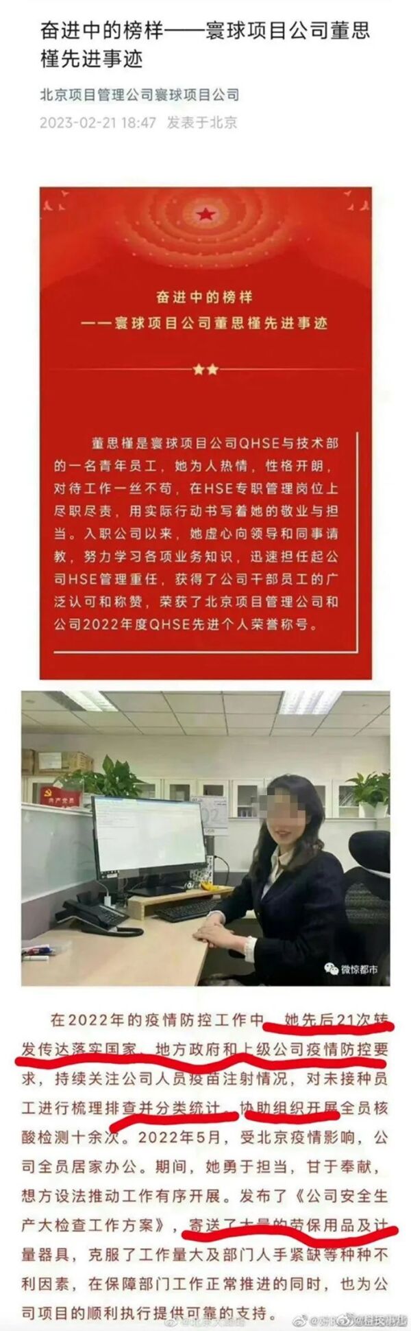 董某某都有哪些先进事迹呢?文中称,“她先后21次传达落实国家、地方政府和上级公司疫情防控要求,持续关注公司人员疫苗注射情况”“组织开展全员核酸检测十余次”“发布了《公司安全大检查方案》,寄送了大量的劳保用品及计量器具”等。