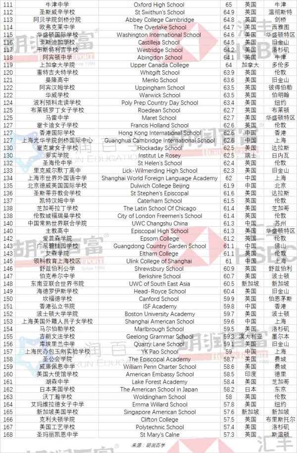 6月10日,胡润百学全球高中排行榜于上海、孟买、伦敦同步发布,将全球顶尖非公立高中,根据毕业生去向、课外活动和学校声誉进行排名,该榜单为胡润百学首次发布。来自12个国家的168所学校上榜,中国14所学校上榜,排名全球第三;第一、第二分别为美国和英国。