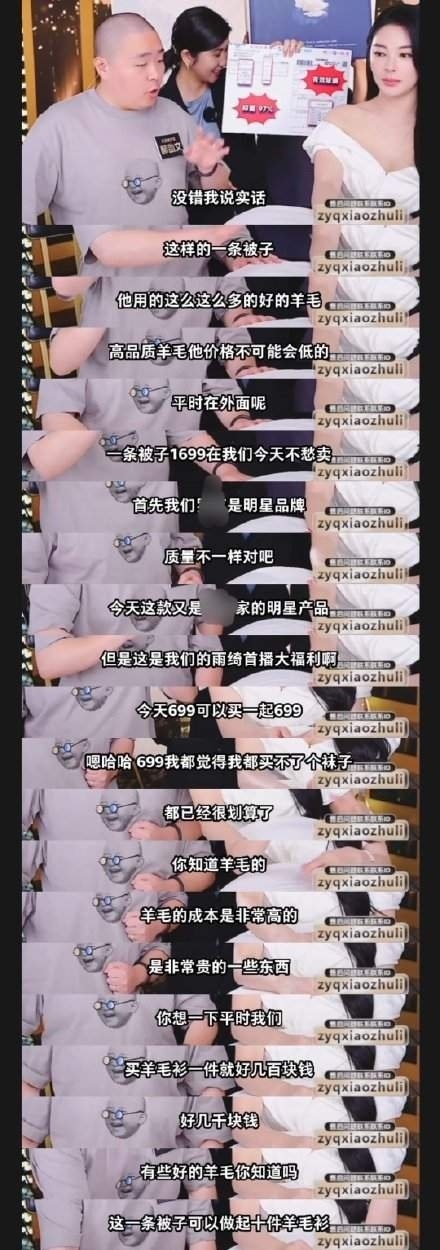 此前,张雨绮在直播卖羊毛被时,身旁的郝邵文问她:“今天699可以吗,雨绮?”张雨绮想了一下说:“699?哈哈哈,699我都觉得我买不了一个袜子!”