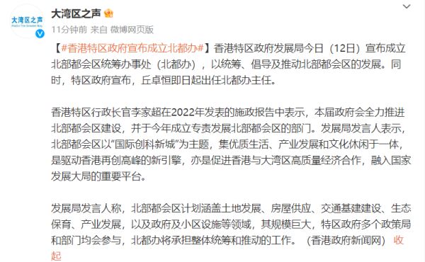 据大湾区之声微博:香港特区政府发展局6月12日宣布成立北部都会区统筹办事处(北都办),以统筹、倡导及推动北部都会区的发展。同时,特区政府宣布,丘卓恒即日起出任北都办主任。