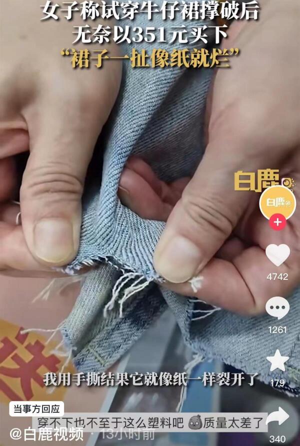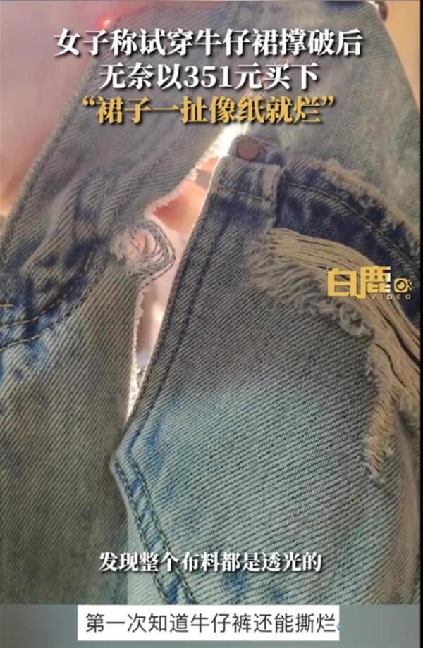 6月8日,山东济南一女子称试穿牛仔裙撑破后,无奈以351元买下。