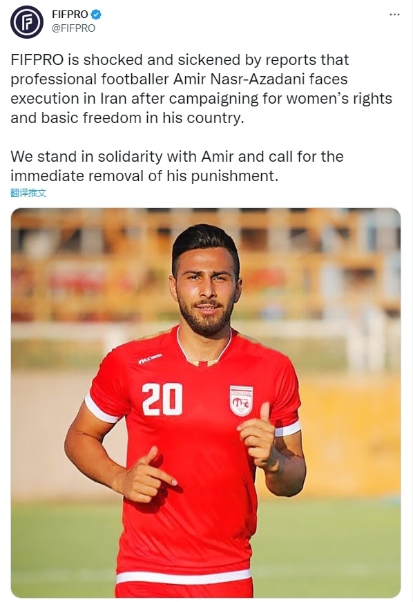 直播吧12月13日讯 FIFPRO(国际足球运动员协会)今日发文,声援因支持伊朗女性而面临处决(execution)的伊朗球员阿米尔-纳斯尔-阿扎达尼。