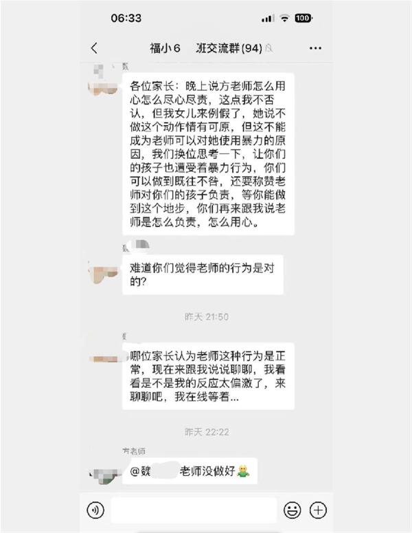 这三名家长的发言顿时引起了魏姓女生家长的不满,并随后质疑三名感恩方老师的家长,表示“让你们的孩子也遭受着暴力行为,你们可以做到既往不咎,还要称赞老师对你们的孩子负责!”“难道你们觉得老师的行为是对的?”