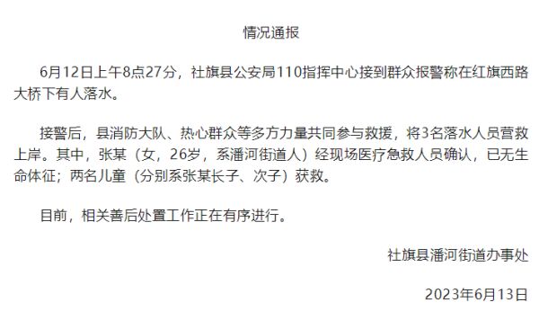 导读:6月12日,有群众报警称有人落水。其中,张某经现场急救人员确认,已无生命体征;两名儿童(张某的孩子)获救。目前,相关善后处置工作正有序进行。