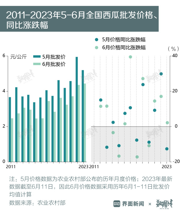 西瓜卖得越来越贵,但增长乏力。界面数据依据农业农村部公开的历年价格数据计算,今年6月1日-11日,全国西瓜单日批发均价为8.88元/斤,高于过去12年同期水平。价格高企的同时,涨幅越来越低。6月西瓜批发价较2022年同期上涨1.8%,明显低于2021年、2022年同期涨幅。此前,5月西瓜价格更是创下12年来最大降幅,同比下跌12.6%。