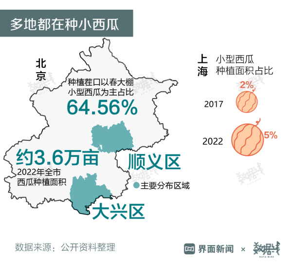 种小西瓜的越来越多。2022年,北京市西瓜种植面积约3.6万亩,种植茬口以春大棚小型西瓜为主,占比超6成。2017-2022年,上海小型西瓜种植面积占比5年间从2%提高到5%。