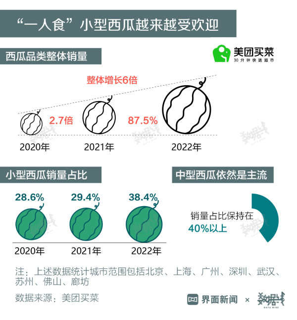 小西瓜逐渐占领市场。据美团买菜数据,2020-2022年,平台上西瓜品类整体销量增长6倍,适合一人或小家庭食用的小型西瓜越来越受欢迎。小型西瓜销量占比3年间上涨近10个百分点。不过,买中型西瓜依然是主流,3年间销量占比保持在40%以上。