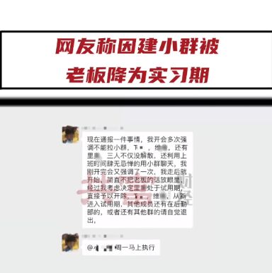 导读:近日,山东一网友称因建小群被老板发现降为实习期,其中一同事被开除。该网友表示目前正在和老板协商中,有“跑路”的想法。