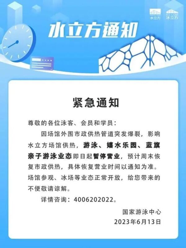 6月13日下午,国家游泳中心发布紧急通知称,因场馆外围市政供热管道突发爆裂,影响水立方场馆供热,游泳、嬉水乐园、蓝旗亲子游泳业态即日起暂停营业,预计周末恢复市政供热,具体恢复营业时间以通知为准。