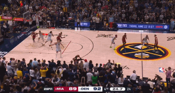 2、还是这个回合,掘金开前场球,穆雷中投没进,巴特勒卡位勾住戈登胳膊,此为犯规,但是裁判并未吹罚,而掘金布朗趁机补篮打进!