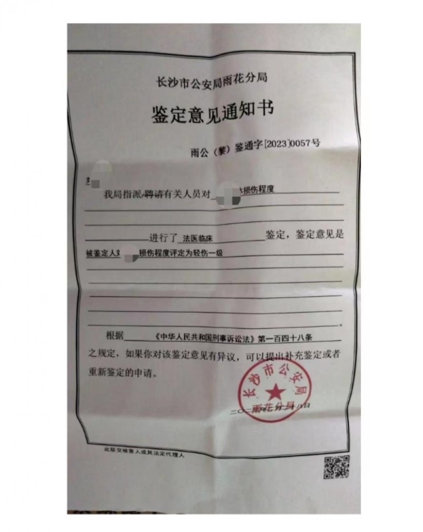 2023年1月28日,长沙市公安局雨花公安分局黎托派出委托湖南中医药大学第一附属医院法医科做了伤情鉴定。2月28日,雨花公安分局向刘女士下发的鉴定意见通知书显示,“我局指派有关人员对刘女士人体损伤程度进行了法医临床鉴定,鉴定意见是被鉴定人的损伤程度评定为轻伤一级”。