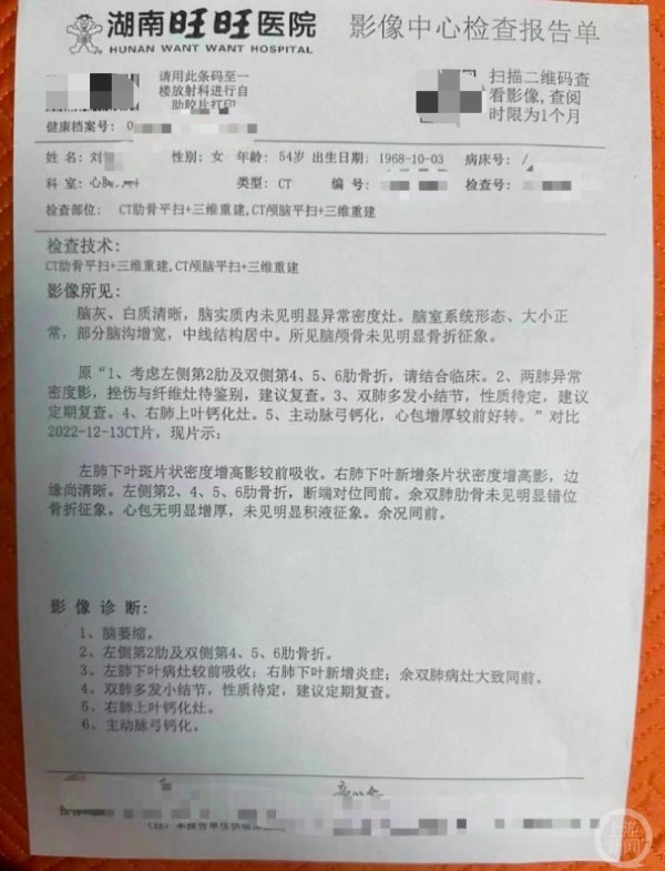 她介绍,2022年12月11日,在居住的长沙家里,因为女儿向其讨教生活细节问题,“他突然没有任何征兆地暴跳,用拳连续猛地击打我的头部、手部和胸部,然后用脚踹我的胸部,持续时间长达近半个小时。我的头皮当时就出血,手部和肘部有多处淤青。” 当晚22时左右,刘女士的胸部出现剧烈疼痛,在儿子的陪同下到医院急诊进行紧急处理,经过医院CT检查及诊断,其左顶部头皮组织肿胀,同时左侧第2、双侧第4、5、6前肋骨折。