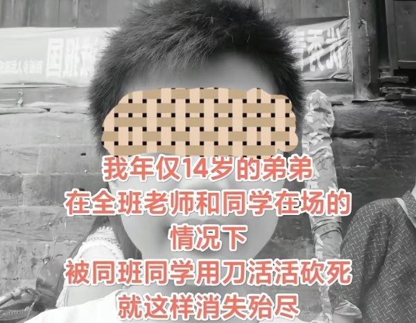 死者的姐姐称,6月12日上午7时许,他即将参加中考的弟弟在教室被同班同学用菜刀砍中脖子身亡。“我弟弟在校成绩优秀,眼看马上参加中考,但就在昨天一切戛然而止。”