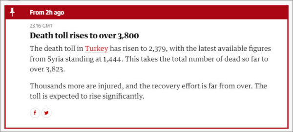 《卫报》报道的数据显示,土耳其的遇难人数已上升至2379人,叙利亚的最新遇难人数为1444人。迄今为止的遇难总人数超过3823人。