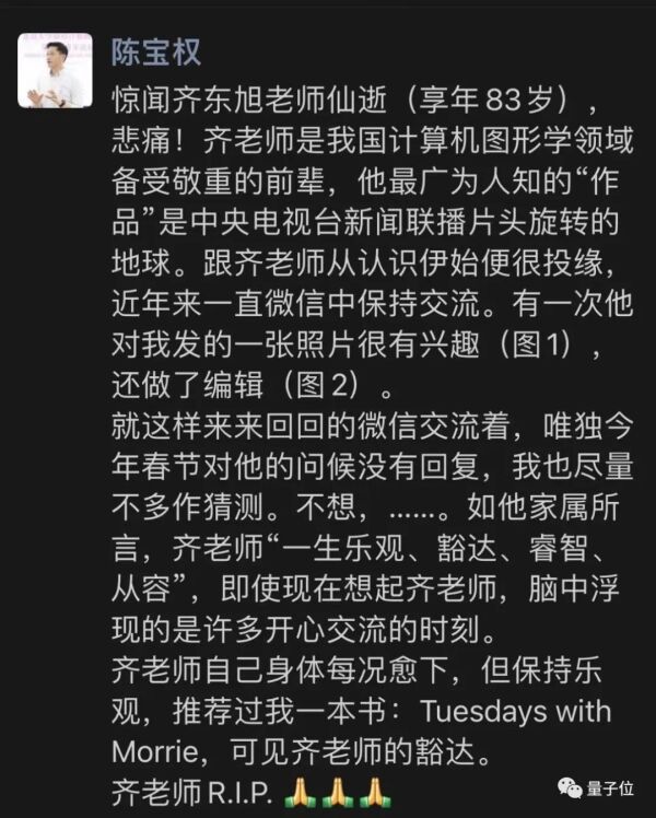 今早,北京大学陈宝权教授也对齐教授的逝世,致以哀悼。