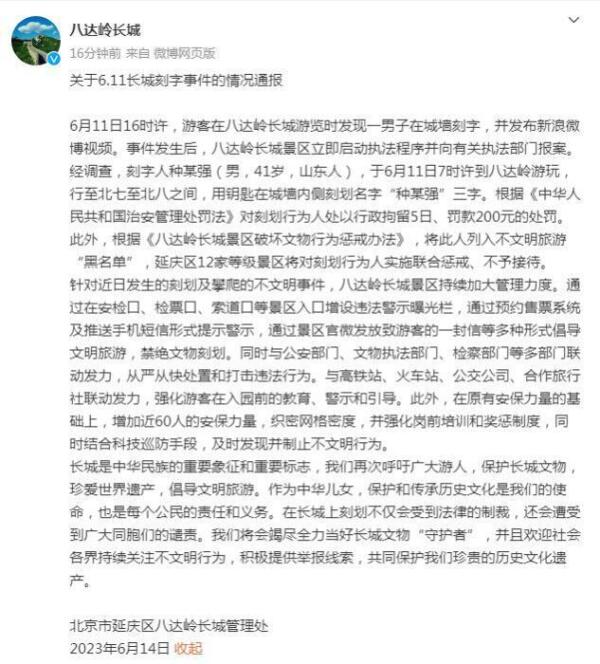 经调查,刻字人种某强(男,41岁,山东人),于6月11日7时许到八达岭游玩,行至北七至北八之间,用钥匙在城墙内侧刻划名字“种某强”三字。根据《中华人民共和国治安管理处罚法》对刻划行为人处以行政拘留5日、罚款200元的处罚。此外,根据《八达岭长城景区破坏文物行为惩戒办法》,将此人列入不文明旅游“黑名单”,延庆区12家等级景区将对刻划行为人实施联合惩戒、不予接待。