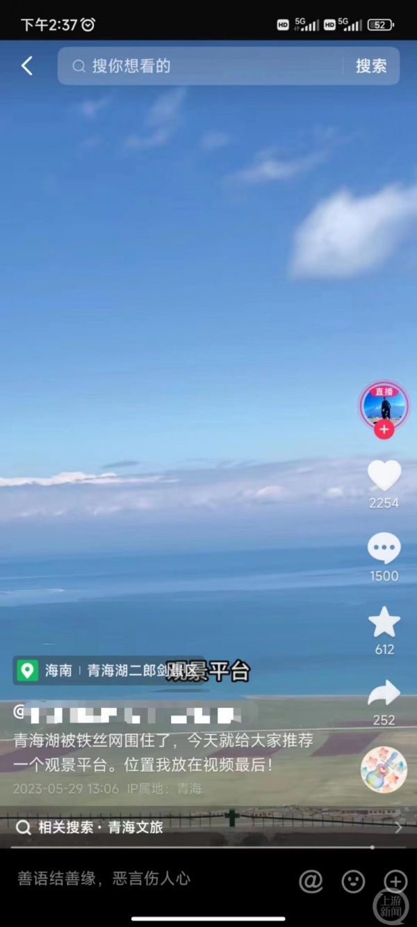 青海湖作为中国内陆最大的咸水湖,是很多游客心心念念的必打卡之地。最近一段时间,针对青海湖最多的吐槽,是广为流传的“青海湖一周360公里都被围起来了”。随便打开抖音或者微博搜索“青海湖”“铁丝围湖”等关键词,类似的吐槽非常多。上游新闻记者在各大平台搜索发现,的确有不少网友发视频吐槽现在除了官方景区,没有其他道路能够走到青海湖水边,还有不少网友留言表示,“既然围起来不让我们看,那我们就不来了。”