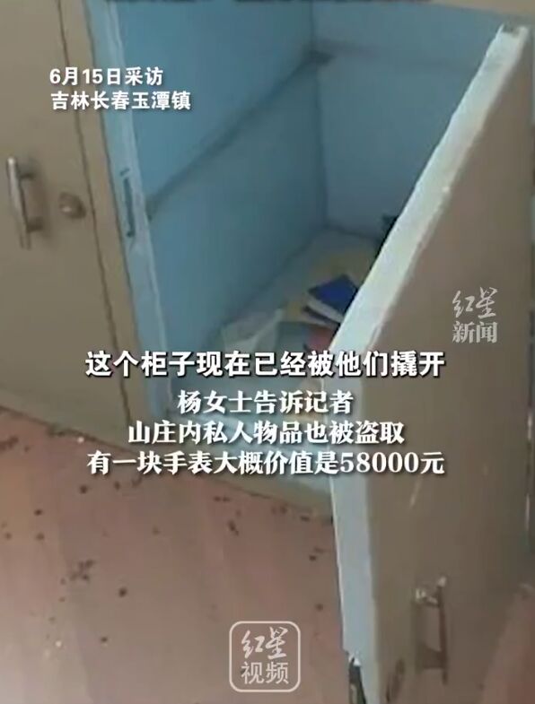 “把我家山庄说成了鬼屋,破窗而入,这个柜子已经被他们撬开了。”15日,杨女士告诉记者,山庄内私人物品也被盗取,有一块手表大概价值是58000元。