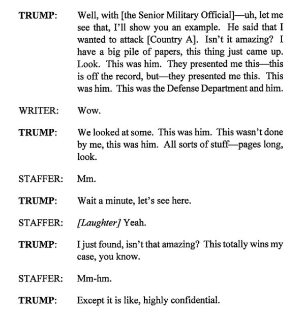 相比大卫·哈巴赫此前的失败案例,这次检方的证据似乎更加扎实。他们指控特朗普至少两次向未获授权的人展示机密文件。在其中一段录音中,特朗普宣称“作为总统,我本可以解密它”,并补充说这些文件目前“仍然是秘密”。此外,他还指示私人男仆藏起文件,并诱导律师寻求隐瞒文件的办法,说:“如果我们直接告诉他们(FBI)这里什么都没有,不是更好吗?”