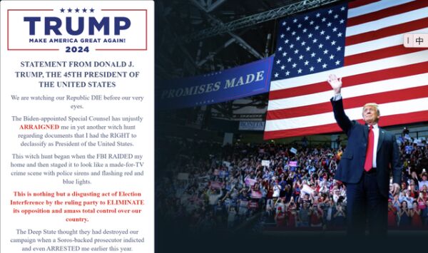 特朗普官方竞选网站广告已更新为对第二次被检控的指控(6月14日截图)