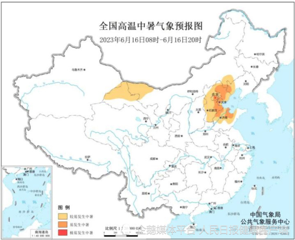 6月16日,全国高温中暑气象预报,中央气象局公共气象服务中心图。
